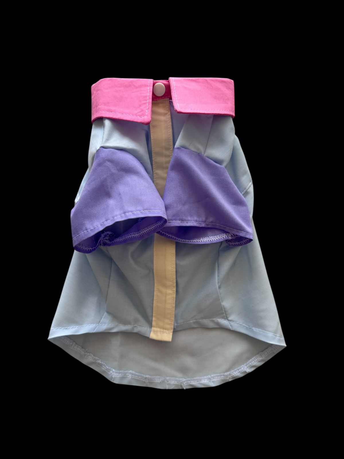 El diseño mezcla lo clásico y lo colorido: cuello fucsia, mangas lila y cuerpo celeste con detalle central en beige. Ideal para quienes aman los looks únicos con personalidad.